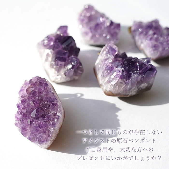 アメジストは円錐形の母岩の中に内側を向いて生えており、それらを切り出したうちの一部をそのままペンダントトップにしました。