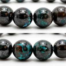 マラカイトやアズライトなどの鉱物が混ざり合った混合石で、独特の色と模様を持ちます。