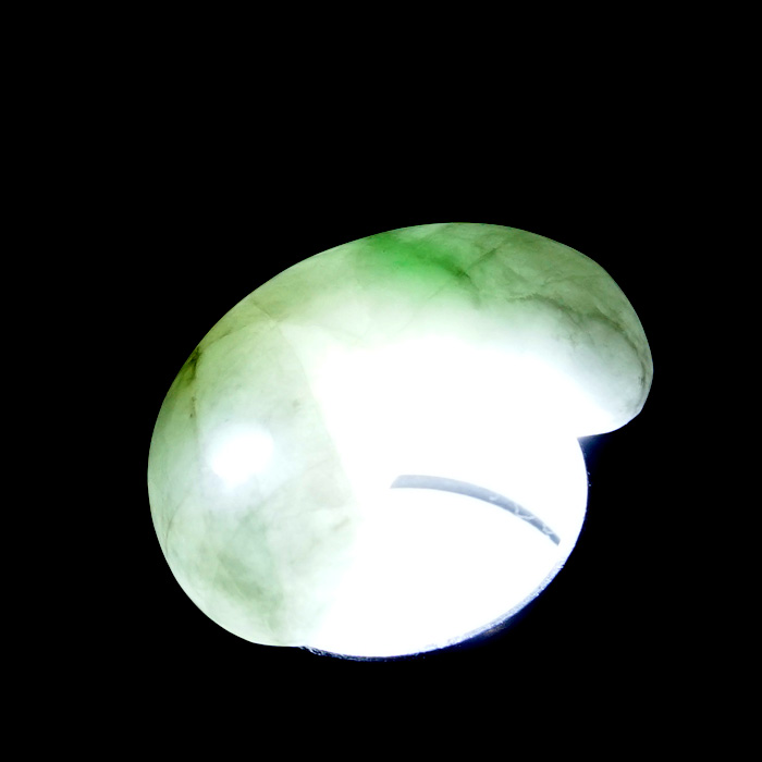 国石として指定された糸魚川産のヒスイ(翡翠)で淡い青の中に斑模様が入っています。