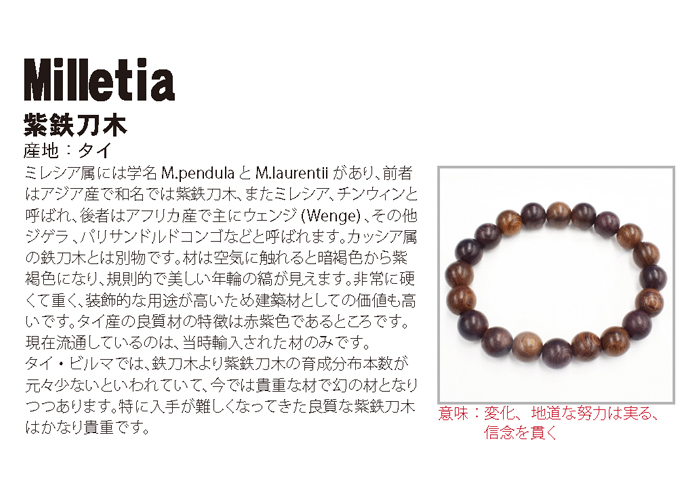 ミレシア属には学名 M.pendula と M.laurentii があり、前者はアジア産で和名では紫鉄刀木、またミレシア、チンウィンと呼ばれ、後者はアフリカ産で主にウェンジ (Wenge) 、その他ジゲラ 、パリサンドルドコンゴなどと呼ばれます。