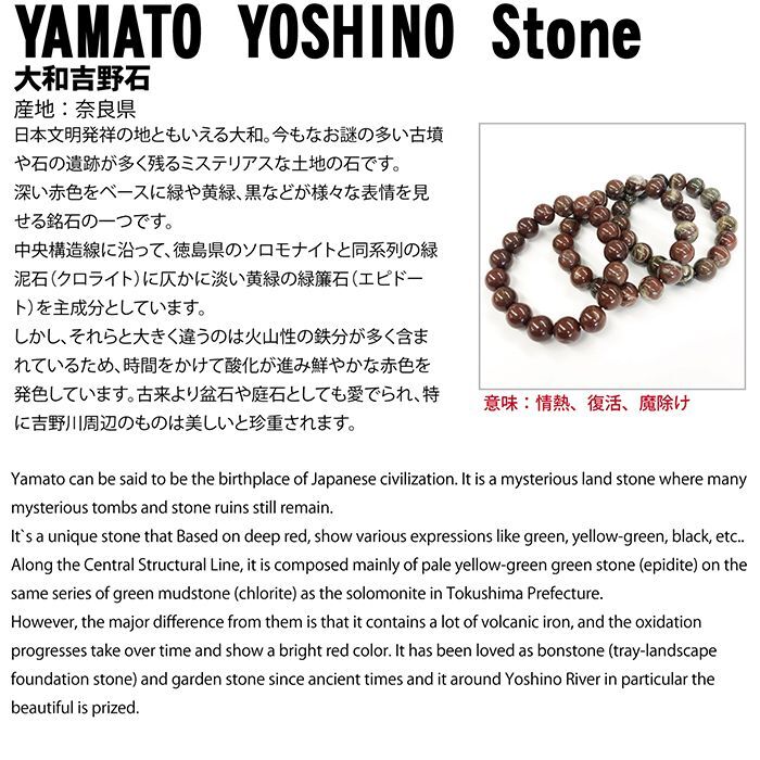 中央構造線に沿って、徳島県のソロモナイトと同系列の緑泥石(クロライト)に仄かに淡い黄緑の緑簾石(エピドート)を主成分としています。