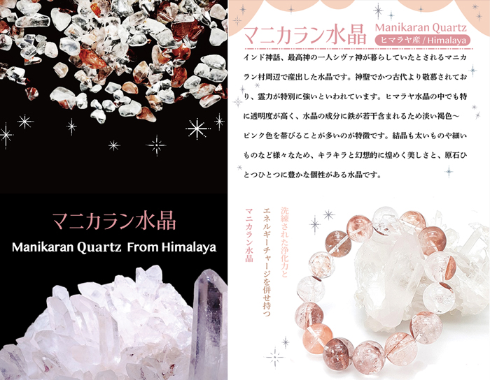 マニカラン産の水晶は透明度の高さとほんのりピンクやオレンジがかった色味が特徴です。