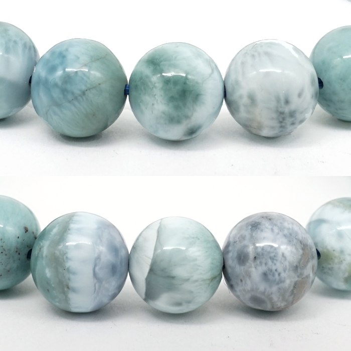 ラリマーが水色の海にやさしく波が揺らめくような白色の美しい波模様が特徴であるのに対し、