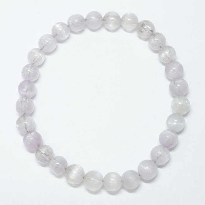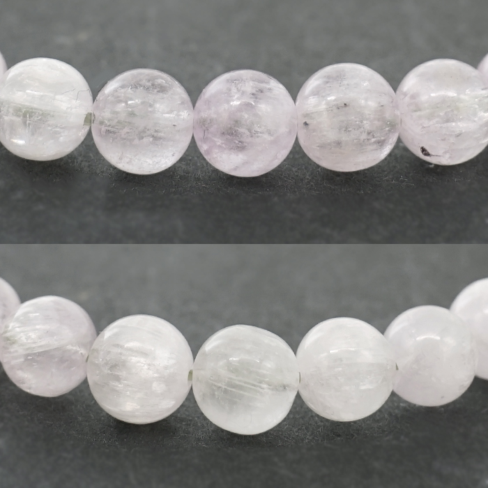 こちらのブレスレットは、ほんのりと淡いグリーンが溶け込んだ、非常に希少なグリーンクンツァイトです。