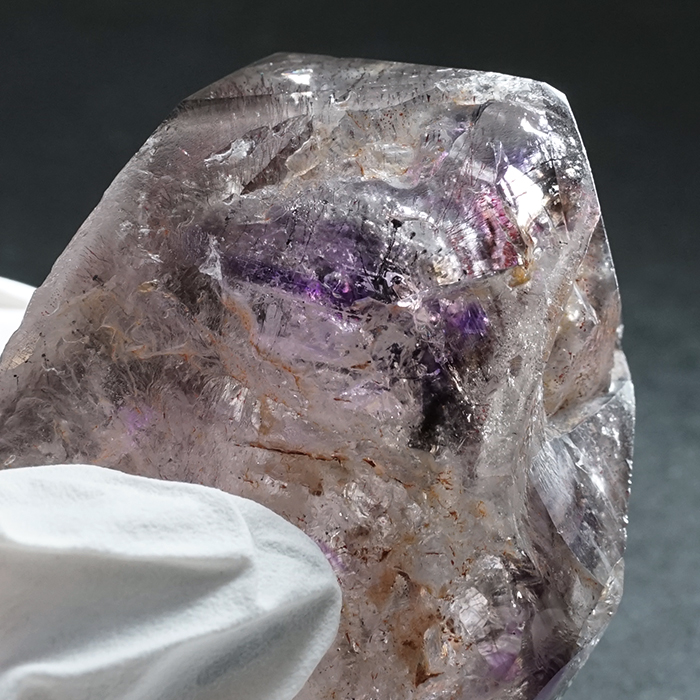 また、スモーキークォーツのような色合いや美しいアメジストカラー、レピドクロサイトの煌めきが見られるなど、非常に表情豊かで、見る者を飽きさせません。