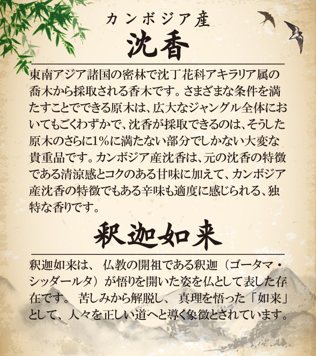 カンボジア産の沈香は、清涼感の中にやわらかな甘みを感じる落ち着いた香調を持ちます。