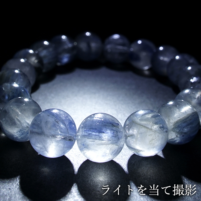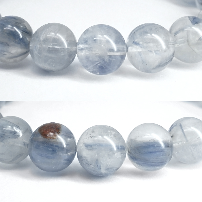 青や緑など色数が様々ですが、特にこちらのブレスレットは、水晶の中にカイヤナイトが内包されており、