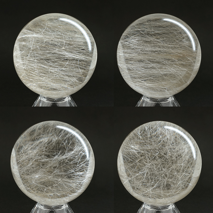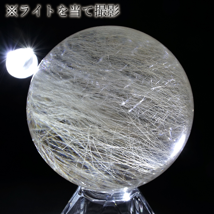 こちらの丸玉は、繊細なルチルが透明度の高い水晶に入り、内部がきらめくように輝く一点ものです。