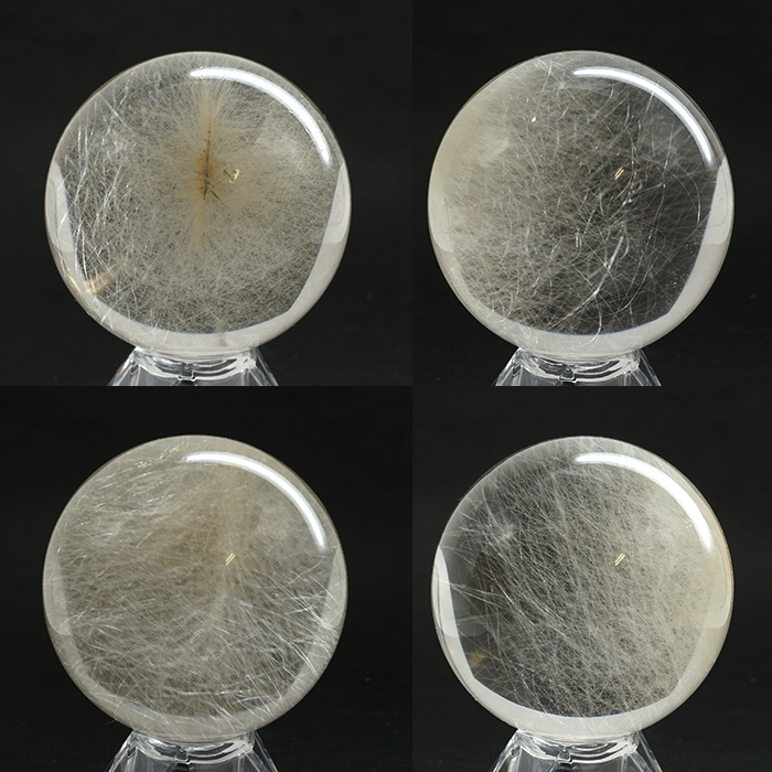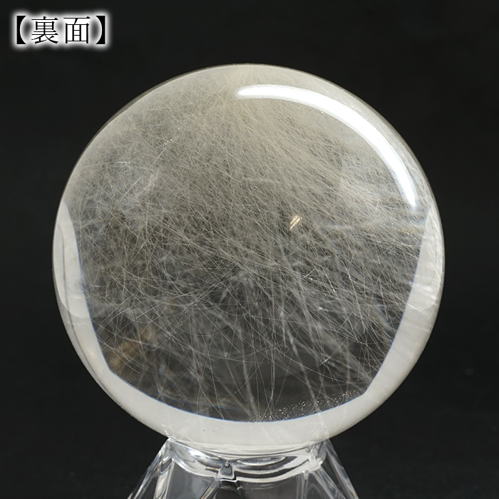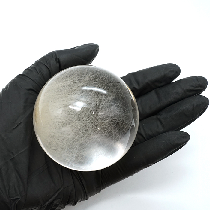 こちらの丸玉は、繊細なルチルが透明度の高い水晶に入り、内部がきらめくように輝く一点ものです。