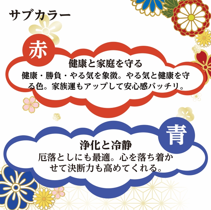 【赤】健康と家庭を守る。健康・勝負・やる気を象徴。やる気と健康を守る。家族運もアップして安定感っちり。