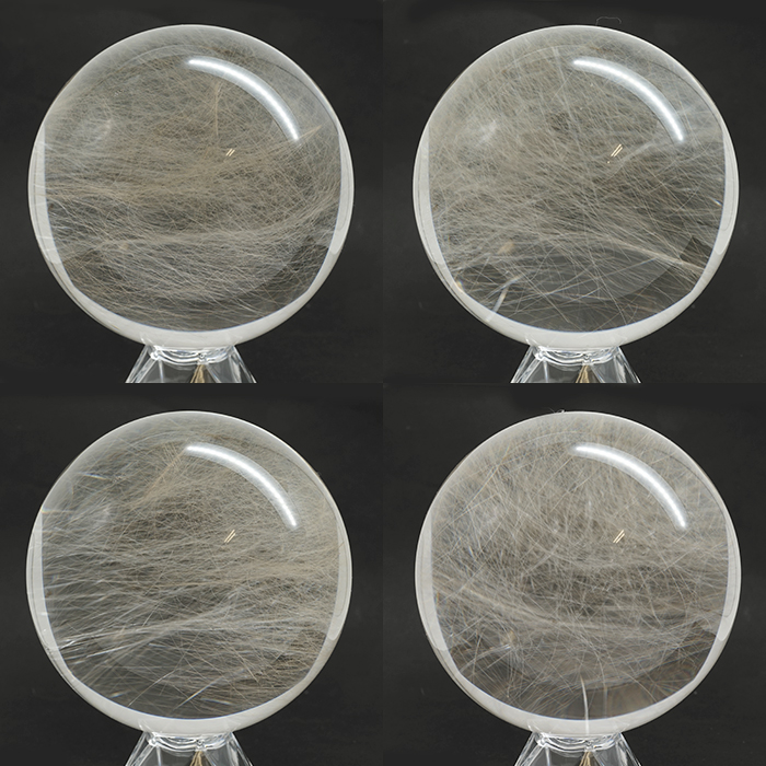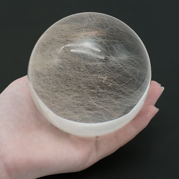 こちらの丸玉は、繊細なルチルが透明度の高い水晶に入り、内部がきらめくように輝く一点ものです。