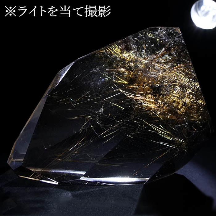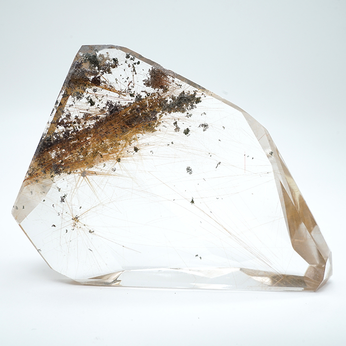 原石のままでは見えにくい結晶構造やルチルの入り方がより明瞭になり、鉱物としての成長の跡を細部まで観察できます。