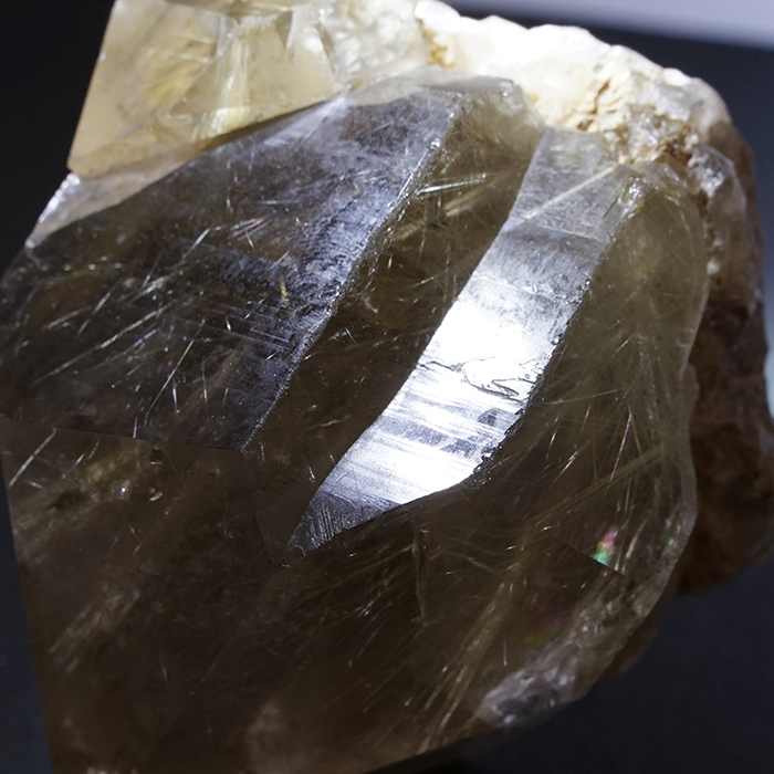 原石のままでは見えにくい結晶構造やルチルの入り方がより明瞭になり、鉱物としての成長の跡を細部まで観察できます。