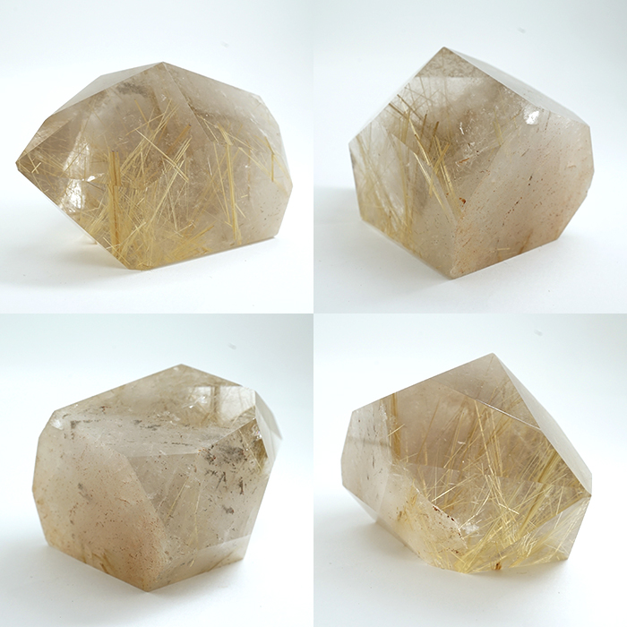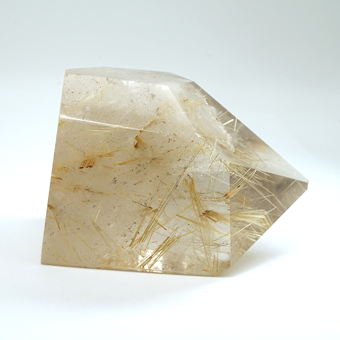 原石のままでは見えにくい結晶構造やルチルの入り方がより明瞭になり、鉱物としての成長の跡を細部まで観察できます。
