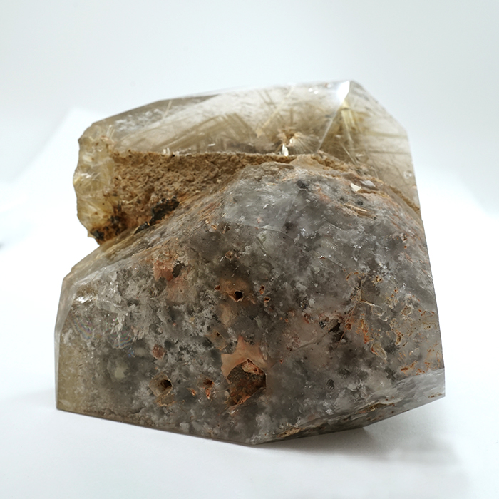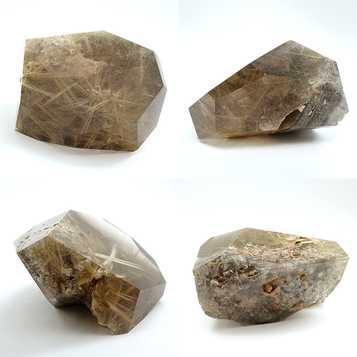 原石のままでは見えにくい結晶構造やルチルの入り方がより明瞭になり、鉱物としての成長の跡を細部まで観察できます。