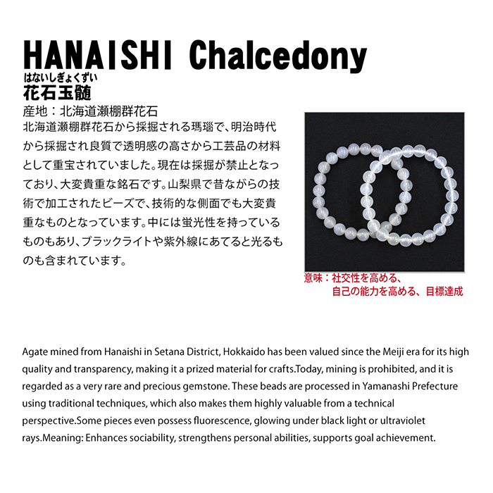 北海道瀬棚群花石から採掘される瑪瑙で、明治時代から採掘され良質で透明感の高さから工芸品の材料として重宝されていました。