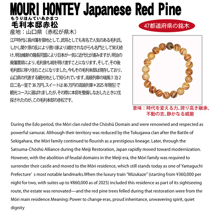 毛利本邸赤松(もうりほんていあかまつ) ブレスレット 10mm 山口県 【日本銘木】47都道府県 MOURI HONTEY Japanese Red Pine 自社製 日本製 天然木 パワーズウッド