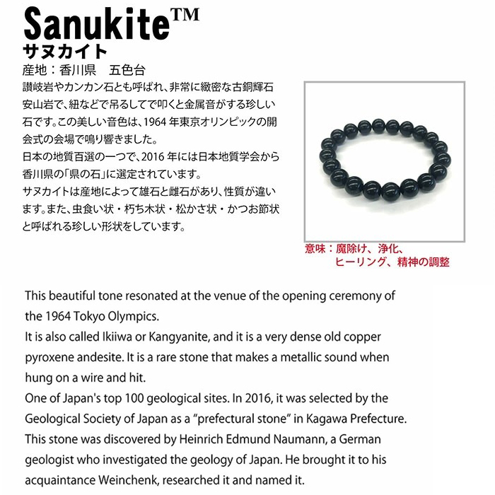 讃岐岩やカンカン石とも呼ばれ、非常に緻密な古銅輝石安山岩で、 紐などで吊るしてで叩くと金属音がする珍しい石です。