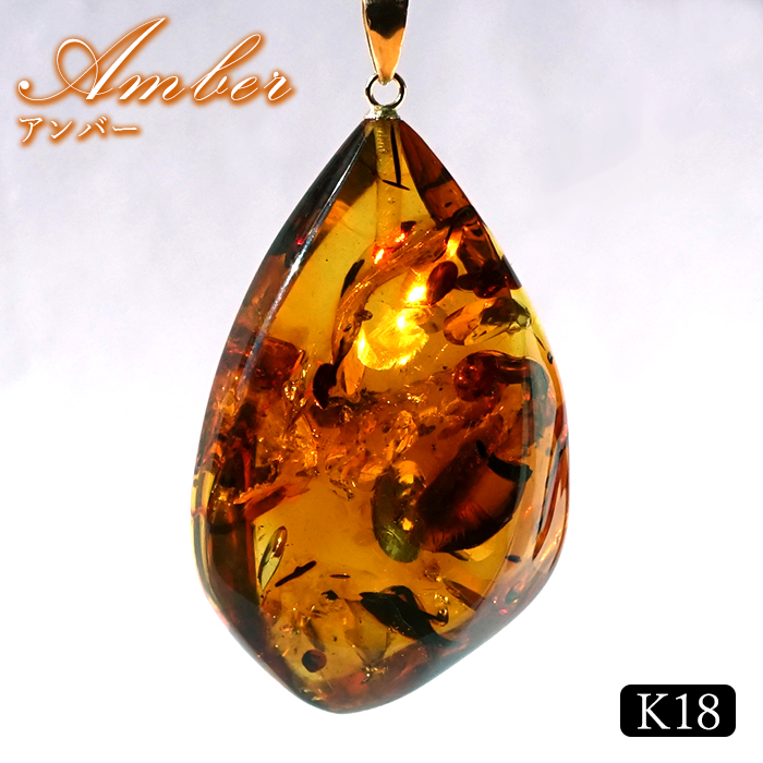 アンバー ペンダントトップ フレイム型 リトアニア産 K18 【一点もの】 Amber アンバー 琥珀 花弁入り フラワーアンバー 日本製 天然石 パワーストーン カラーストーン [15020000244002512004]