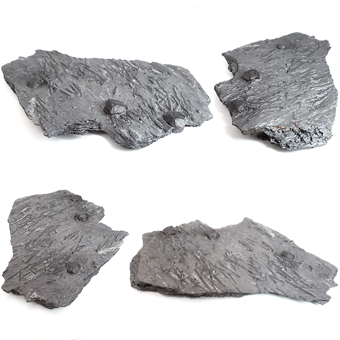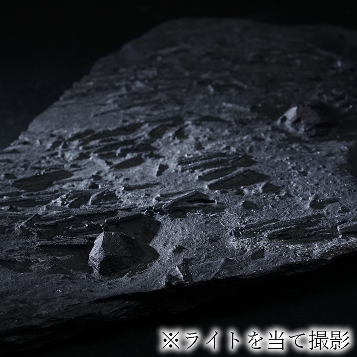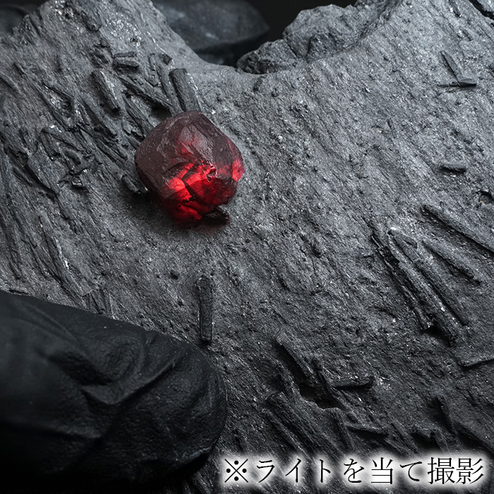 グラファイトは光をほとんど通さない性質を持つため、その内部に形成されたガーネットは、裏側から光を当てることで深紅の色彩がより鮮やかに浮かび上がります。