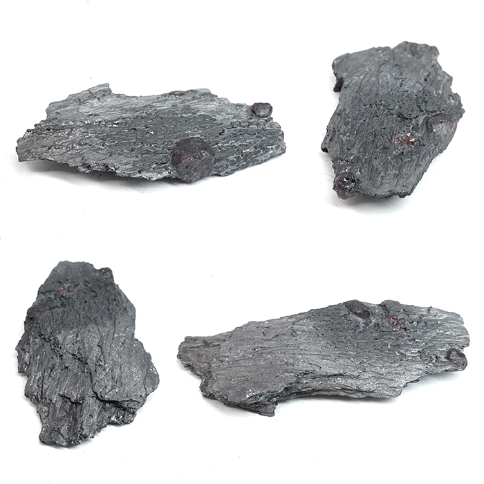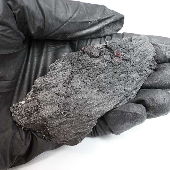 グラファイトは光をほとんど通さない性質を持つため、その内部に形成されたガーネットは、裏側から光を当てることで深紅の色彩がより鮮やかに浮かび上がります。