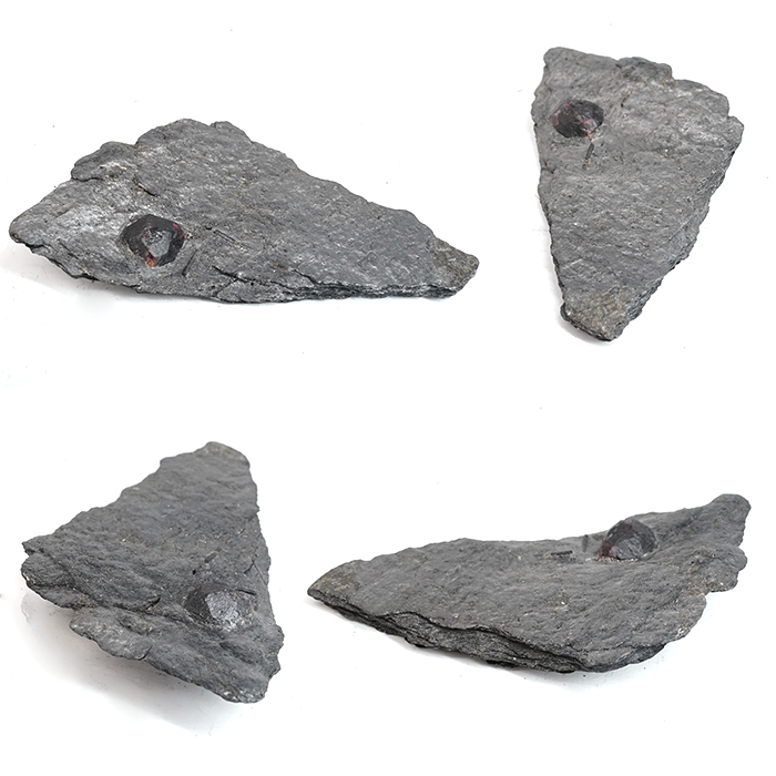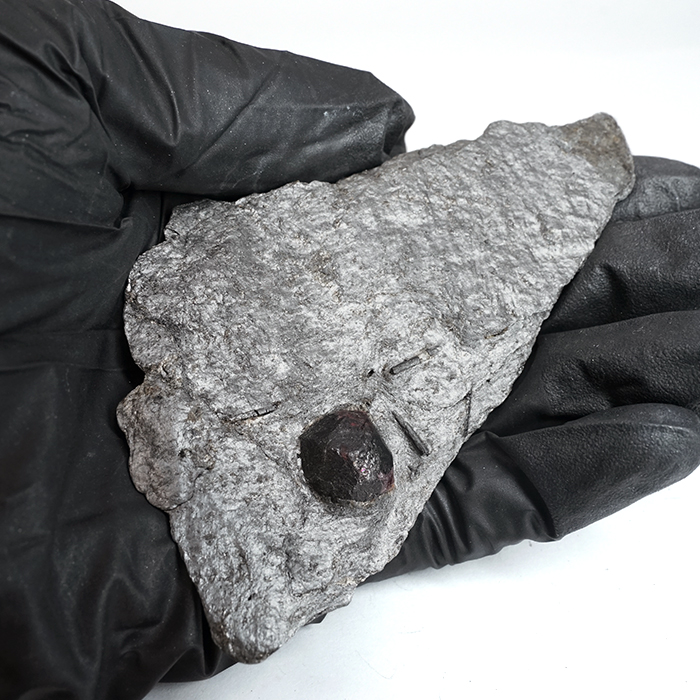 グラファイトは光をほとんど通さない性質を持つため、その内部に形成されたガーネットは、裏側から光を当てることで深紅の色彩がより鮮やかに浮かび上がります。