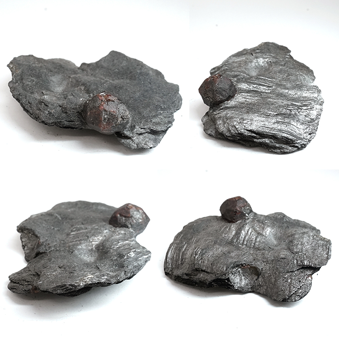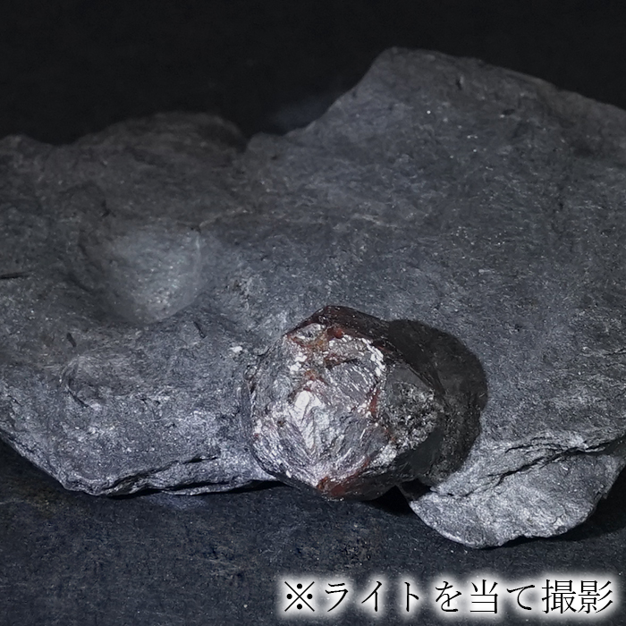 グラファイトは光をほとんど通さない性質を持つため、その内部に形成されたガーネットは、裏側から光を当てることで深紅の色彩がより鮮やかに浮かび上がります。
