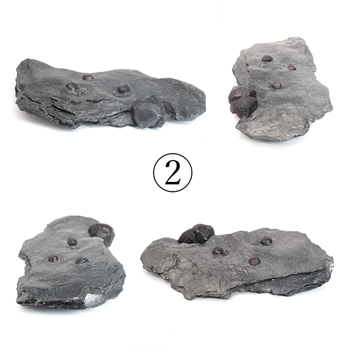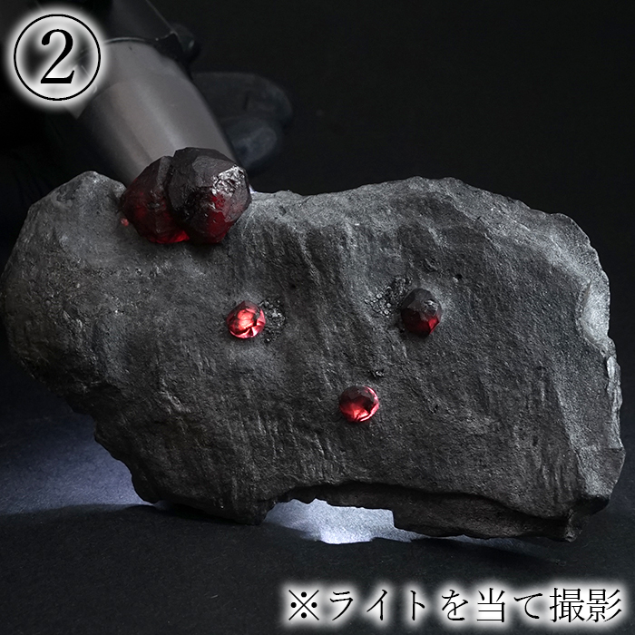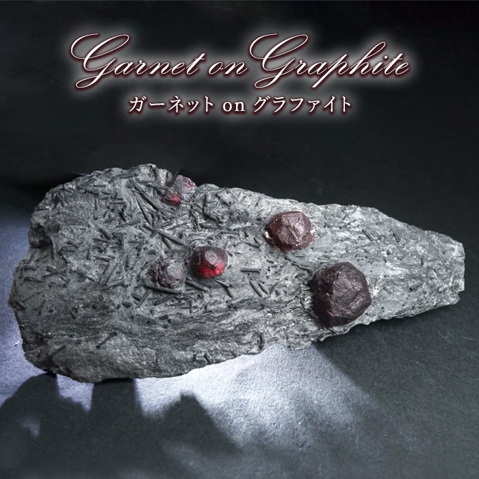 グラファイトは光をほとんど通さない性質を持つため、その内部に形成されたガーネットは、裏側から光を当てることで深紅の色彩がより鮮やかに浮かび上がります。