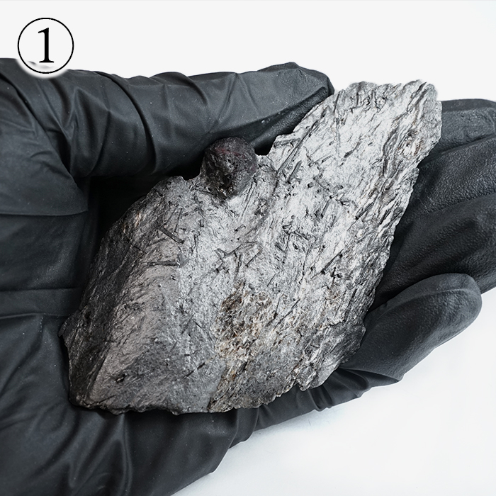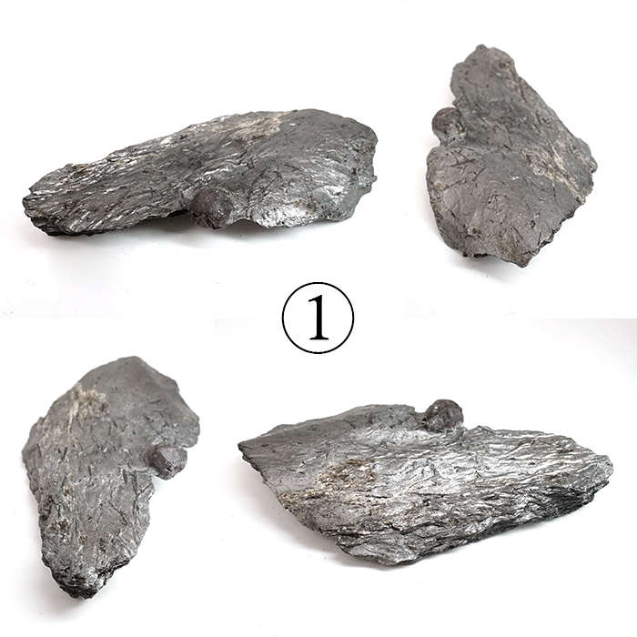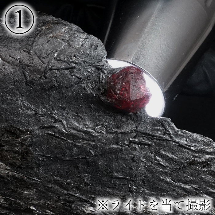 グラファイトは光をほとんど通さない性質を持つため、その内部に形成されたガーネットは、裏側から光を当てることで深紅の色彩がより鮮やかに浮かび上がります。