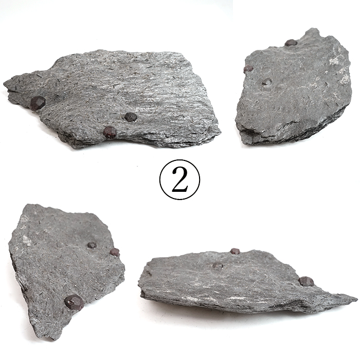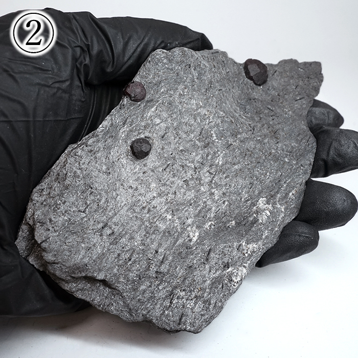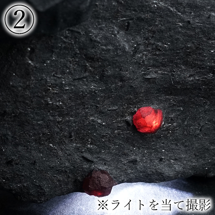 グラファイトは光をほとんど通さない性質を持つため、その内部に形成されたガーネットは、裏側から光を当てることで深紅の色彩がより鮮やかに浮かび上がります。