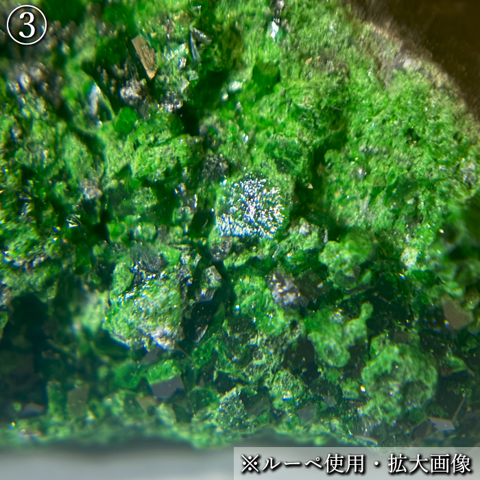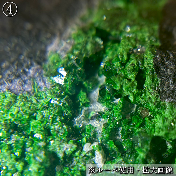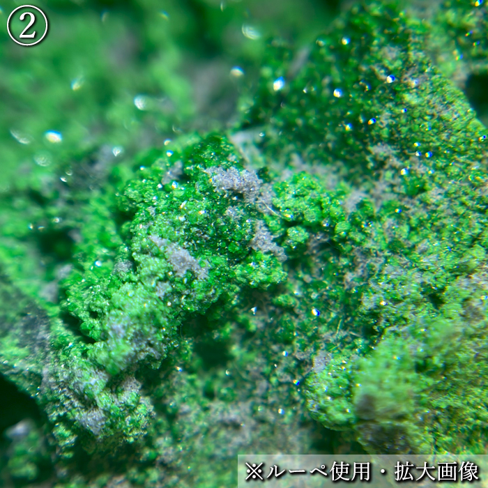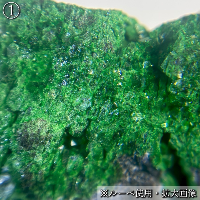 鮮やかなグリーンにキラキラと輝く小さな結晶は美しくとても個性的で、それがウバロバイトガーネットの大きな魅力となっています。
