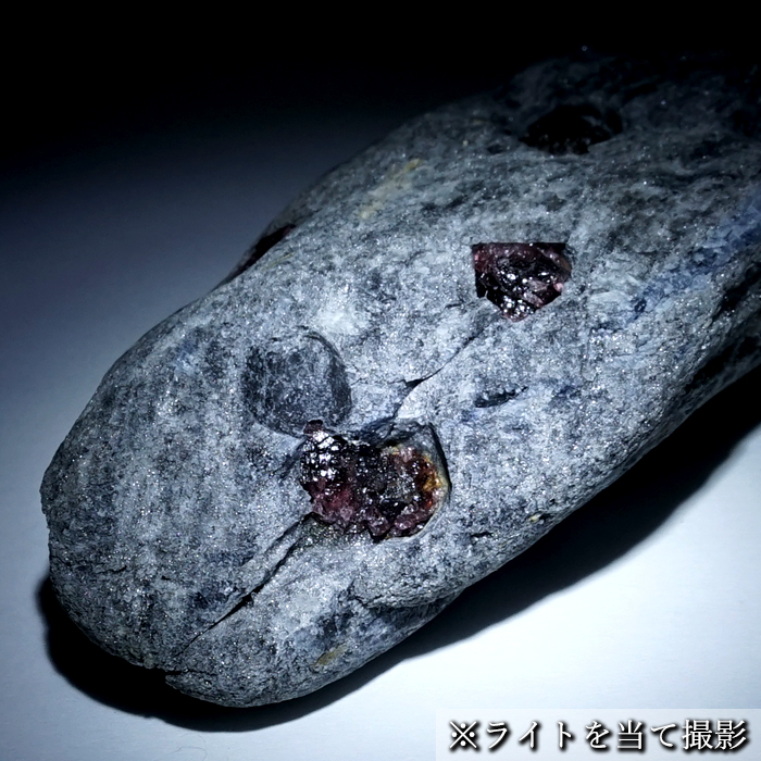 その中に赤褐色のアルマンディンが埋まるように共生しており、「岩石の中で育った」ことがはっきり分かる構造です。