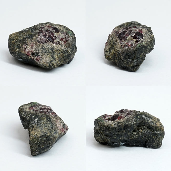 こちらのお品は、暗色の母岩中に丸みを帯びたパイロープが収まり、その周囲にダイオプサイドが伴っている共生標本。