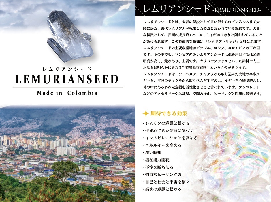 主な産地はブラジル、ロシア、コロンビアなどが知られており、なかでもコロンビア産のレムリアンシードは、特に透明度が高く艶やかな結晶として評価されています。